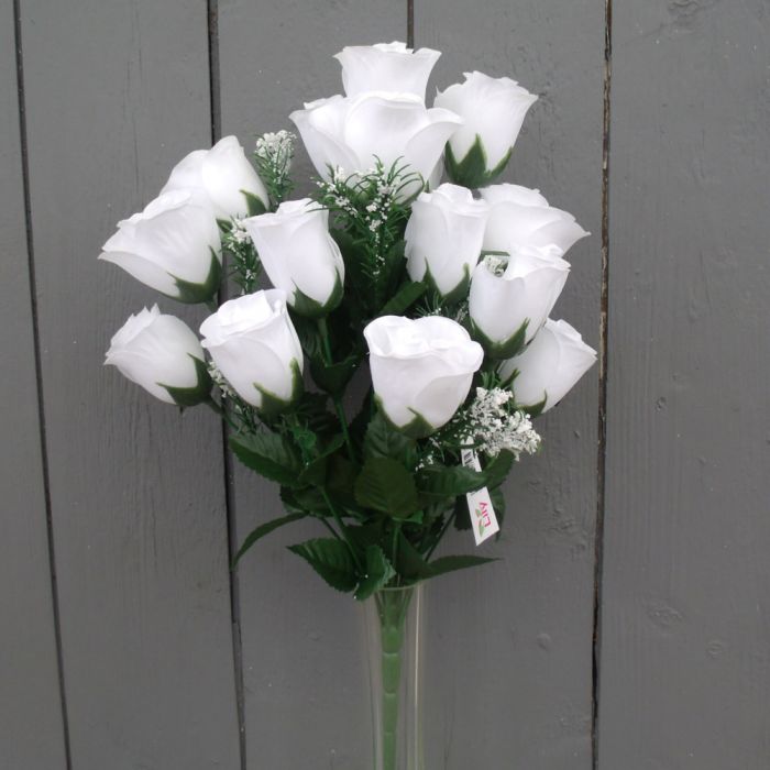 Rose bush with 18 pure white rose buds with green foliage and white gypsophila.