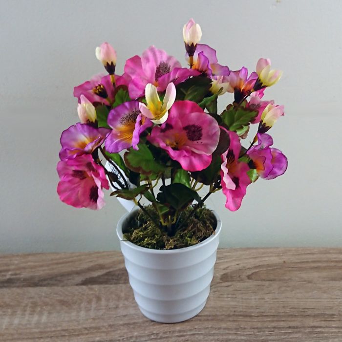 A beautiful small arrangement made with our pansy bushed that we pot in a white plastic pot.