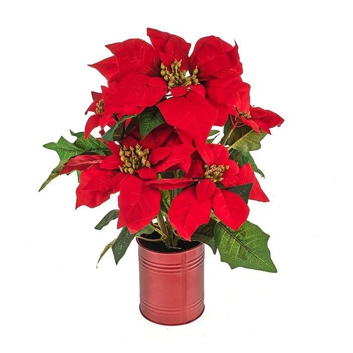 A good quality large artificial poinsettia plant with 5 bright red flower heads. Potted in a red metal pot.