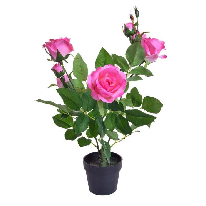 A pink rose plant with 3 rose open rose flowers and 3 buds.