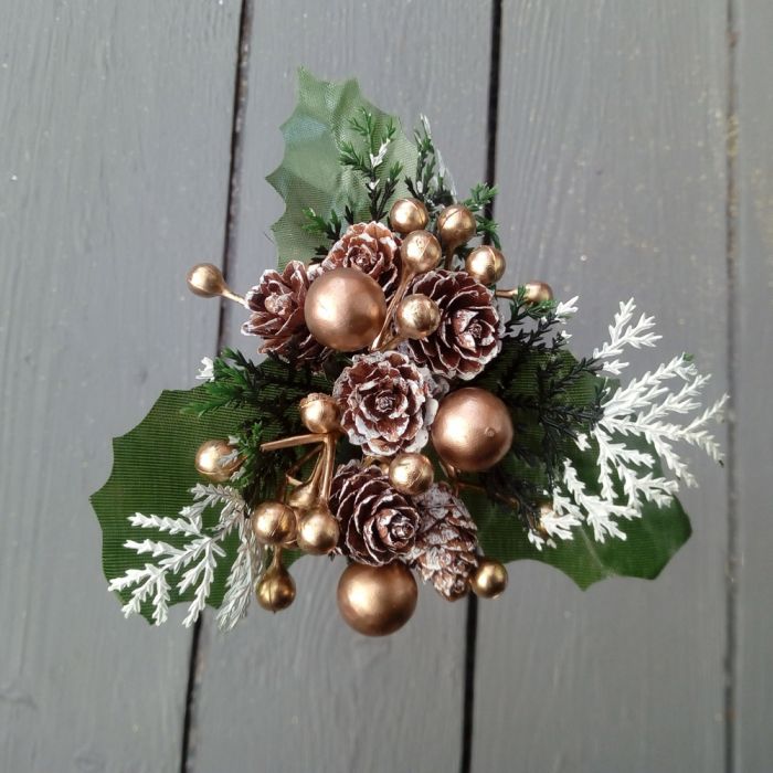 A Christmas pick with gold berries and pine cones surrounded by fern and leaves.