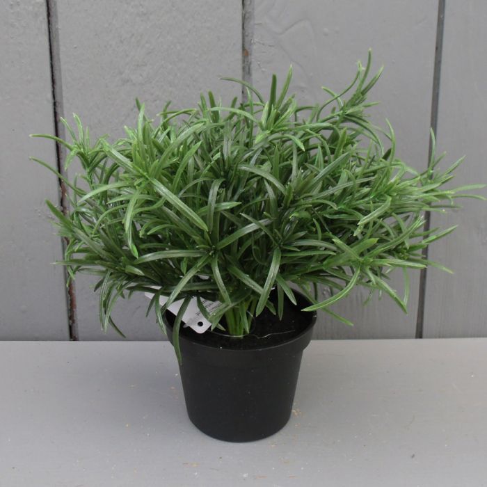 Artificial rosemary herb plant set in a black plastic pot. The rosemary plant is all plastic material.