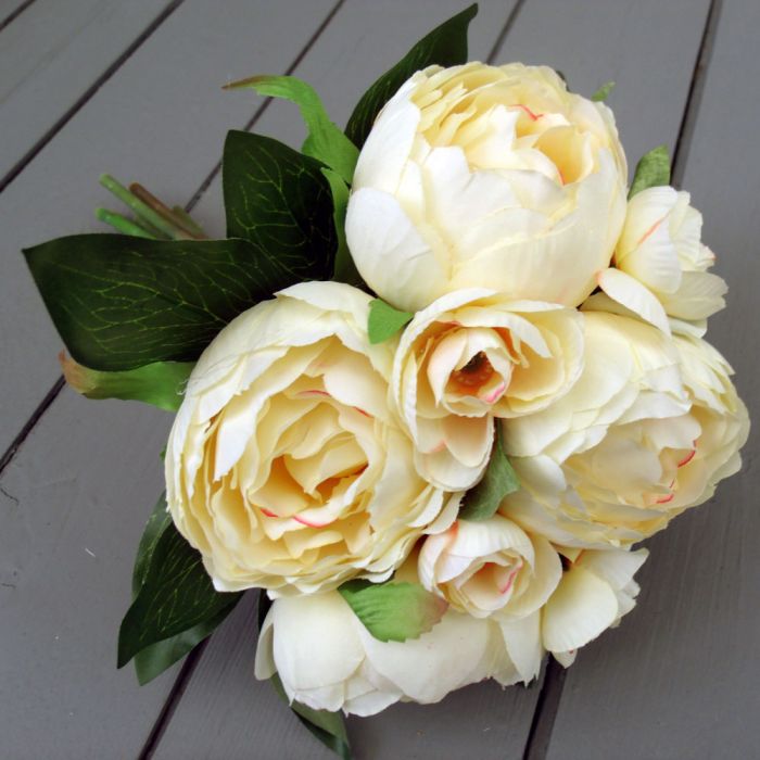 Realistic artificial peony flowers that are a pale yellow / pale lemon colour. Ideal for pastel colour floral arrangement.