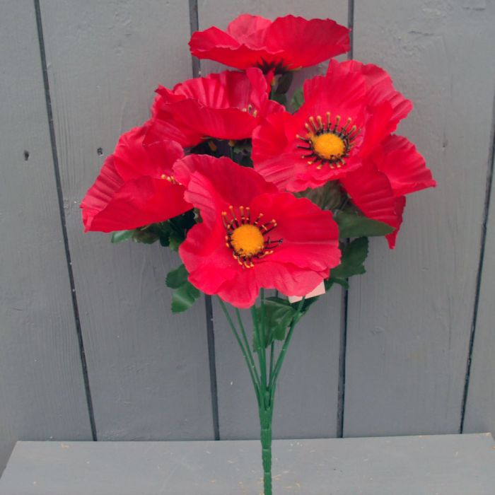 An attractive artificial poppy bush with 8 large flower heads. The flower heads are dark red and have yellow centres and are 10cm in diameter.