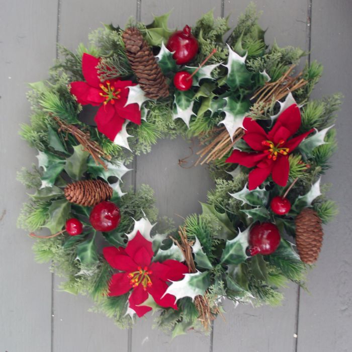 Artificial 40cm Red Poinsettia, Twig, Cone and Berry Wreath