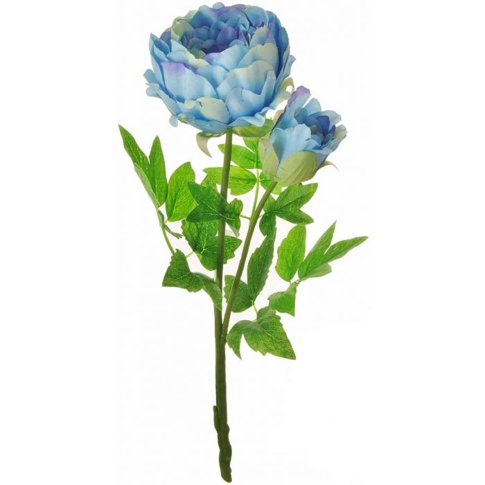 An artificial light blue peony flower with 1 large flower head and 1 bud.