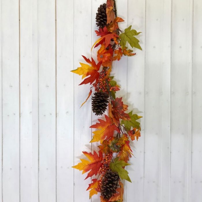 A good quality autumn garland with large maple leaves, cones, pumpkins and berries.