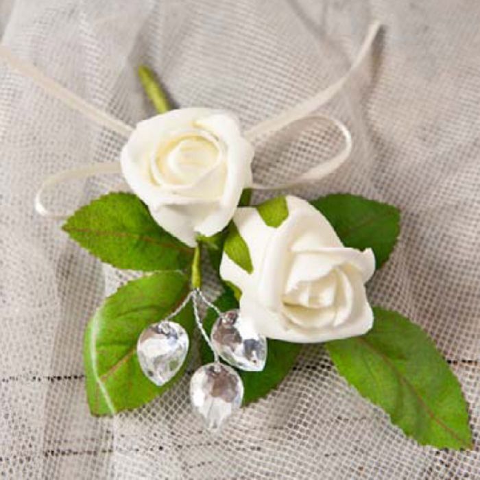 A pretty cream buttonhole consisting of two cream roses, jewel embellishment and rose leaves complete with an ivory satin bow.