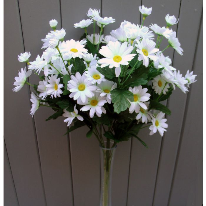 A large 48cm tall bush full of white silk daisy flowers. Contains 18 stems with each stem have many daisy flower heads.