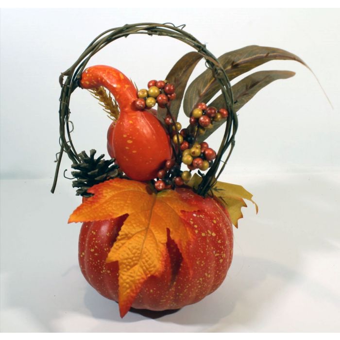 Large pumpkin with 2 smaller pumpkins, cone and leaves on a wicker hanger.