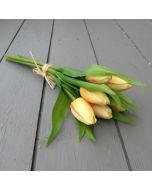 A bunch of 6 closed bud dark red tulips, 32 cm tall. These are tied together and come in a cellophane sleeve.