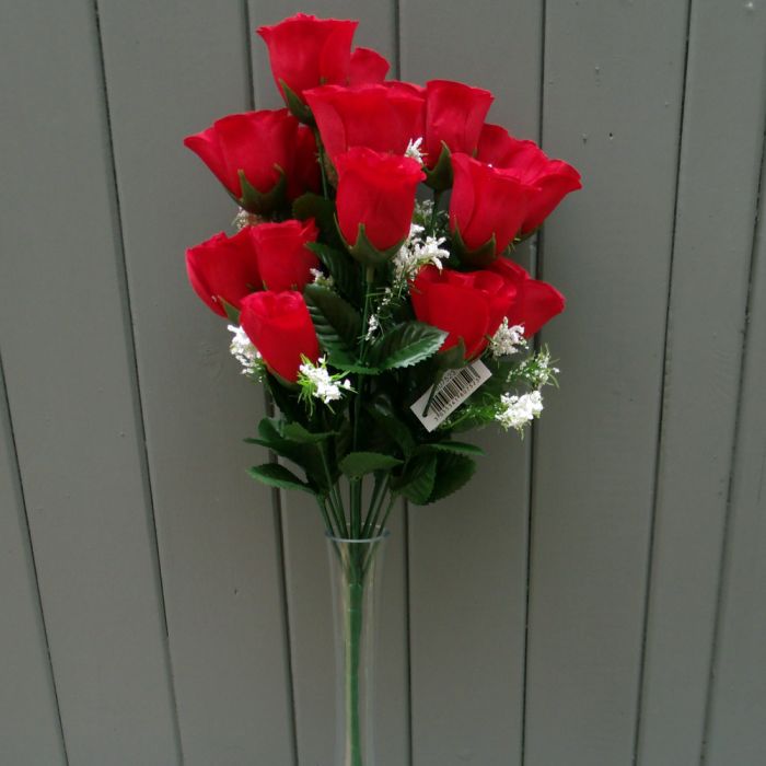 Artificial red rose bush which has 18 silk flower heads with green foliage and white gypsophila.